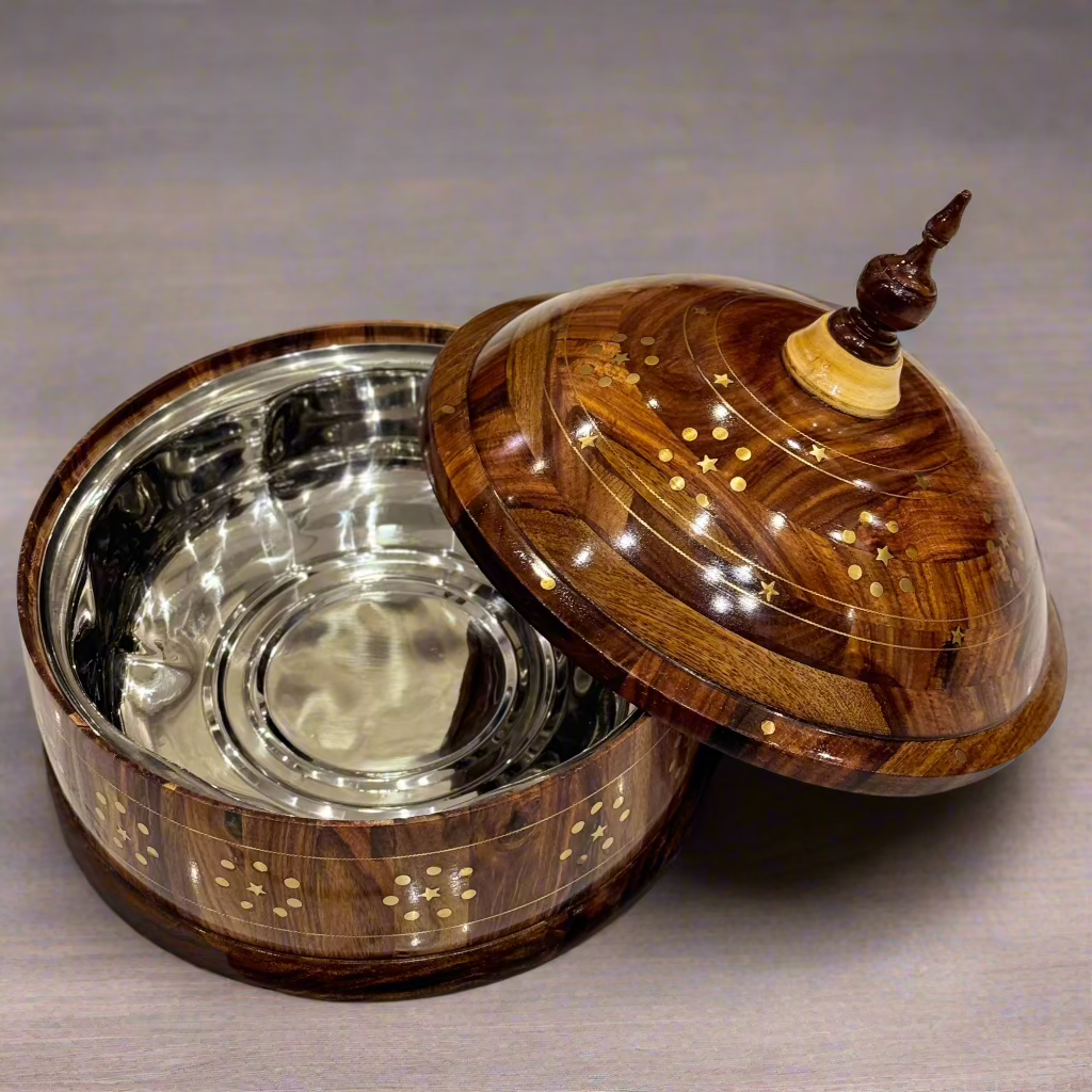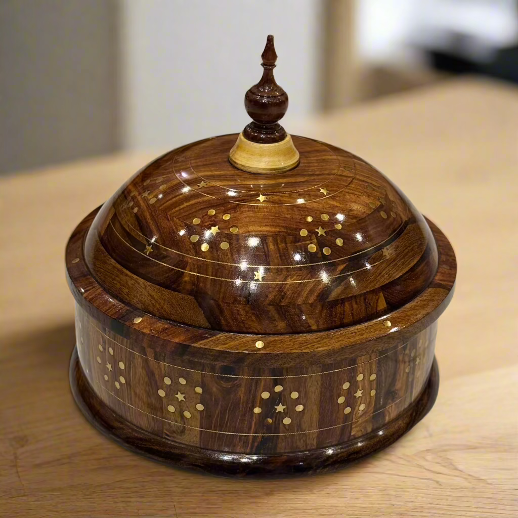 This exquisite wooden hot pot is a masterful blend of functionality and ornate design. Crafted from rich, dark wood, it features an elegant round shape with a domed lid that is both practical for heat retention and striking in appearance. The surface of the hot pot and its lid are embellished with inlaid patterns of stars and dots, made from lighter wood and possibly mother-of-pearl, creating a charming celestial theme.